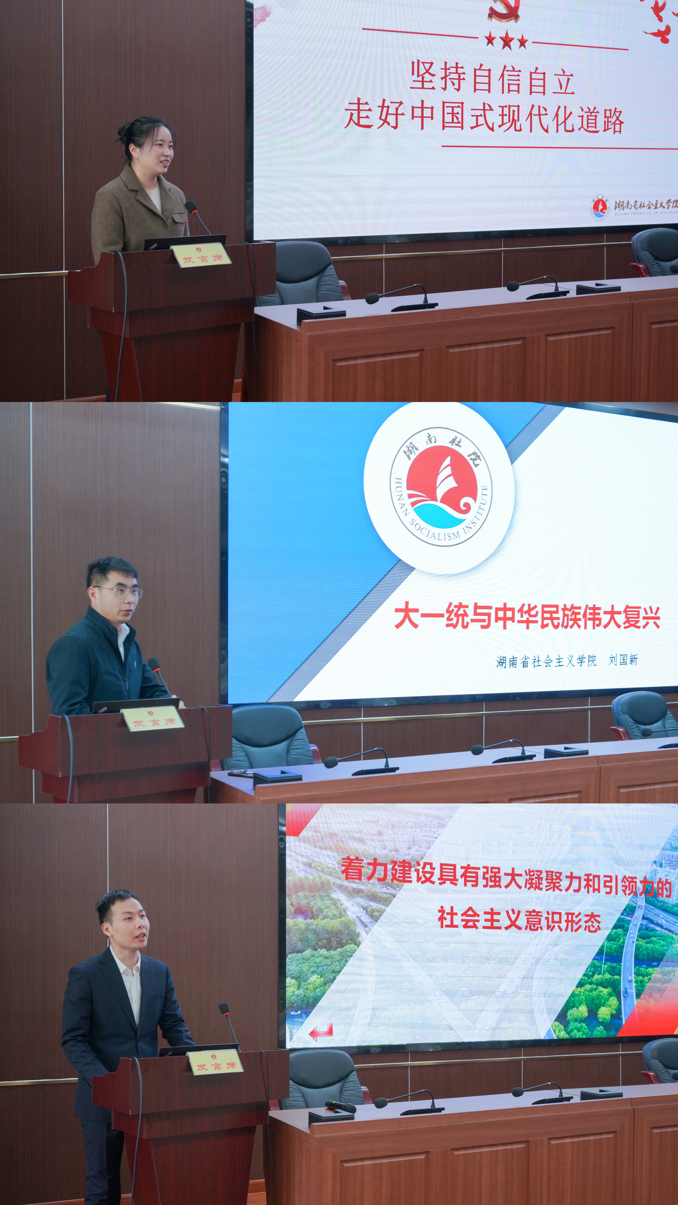 会上,副教授张彩云围绕如何坚持自信自立走好中国式现代化道路展开分享,青年教师刘国新探讨大一统如何助力中华民族伟大复兴,青年教师蒋华福探讨在新时代新征程上着力建设具有强大凝聚力和引领力的社会主义意识形态的必要性和路径。三位老师从不同角度阐释各自对党的创新理论的理解,结构完整,逻辑严密,使全体干部职工更加深刻理解习近平新时代中国特色社会主义思想,坚定拥护“两个确立”、坚决做到“两个维护”。