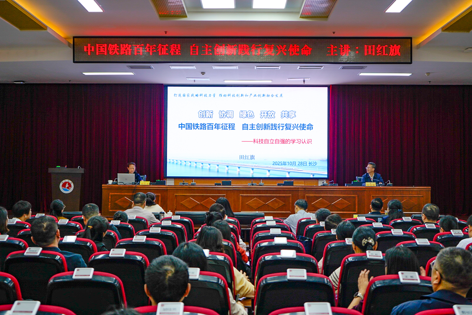 10月28日上午,中国工程院院士、民革中央副主席、湖南省科协主席田红旗在省社会主义学院作题为《中国铁路百年征程 自主创新践行复兴使命》的专题辅导报告。省委统战部副部长、省社会主义学院党组书记符俊根主持报告会。