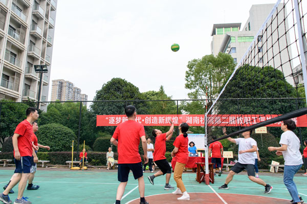 此次气排球比赛共3天时间,共5轮10场,社院全体干部职工以工会小组为单位单独或联合组成五支参赛队,分别是沙龙手机官方网站_沙龙(中国)队、机关党委科研处队、教务处教研部队、行财处队、文化交流部图书信息部队,每队12人。教师节当天进行了第一轮比赛,分别由机关党委科研处队对阵文化交流部图书信息部队、教务处教研部队对阵行财处队。4支队伍中既有高手隐匿,又有“菜鸟”现身,既有一击即中的优美弧线,也有连连失误的排球曲线,正是重在参与的热情点燃了全场,大家奋起拼击、你来我去,好不热闹,篮球场上呐喊声、加油声、笑声不绝于耳。这样一个教师节活动,既锻炼提高了干部职工的身份素质,更是增强了团队意识,充分展示了新时代湖南社院的精神风貌!